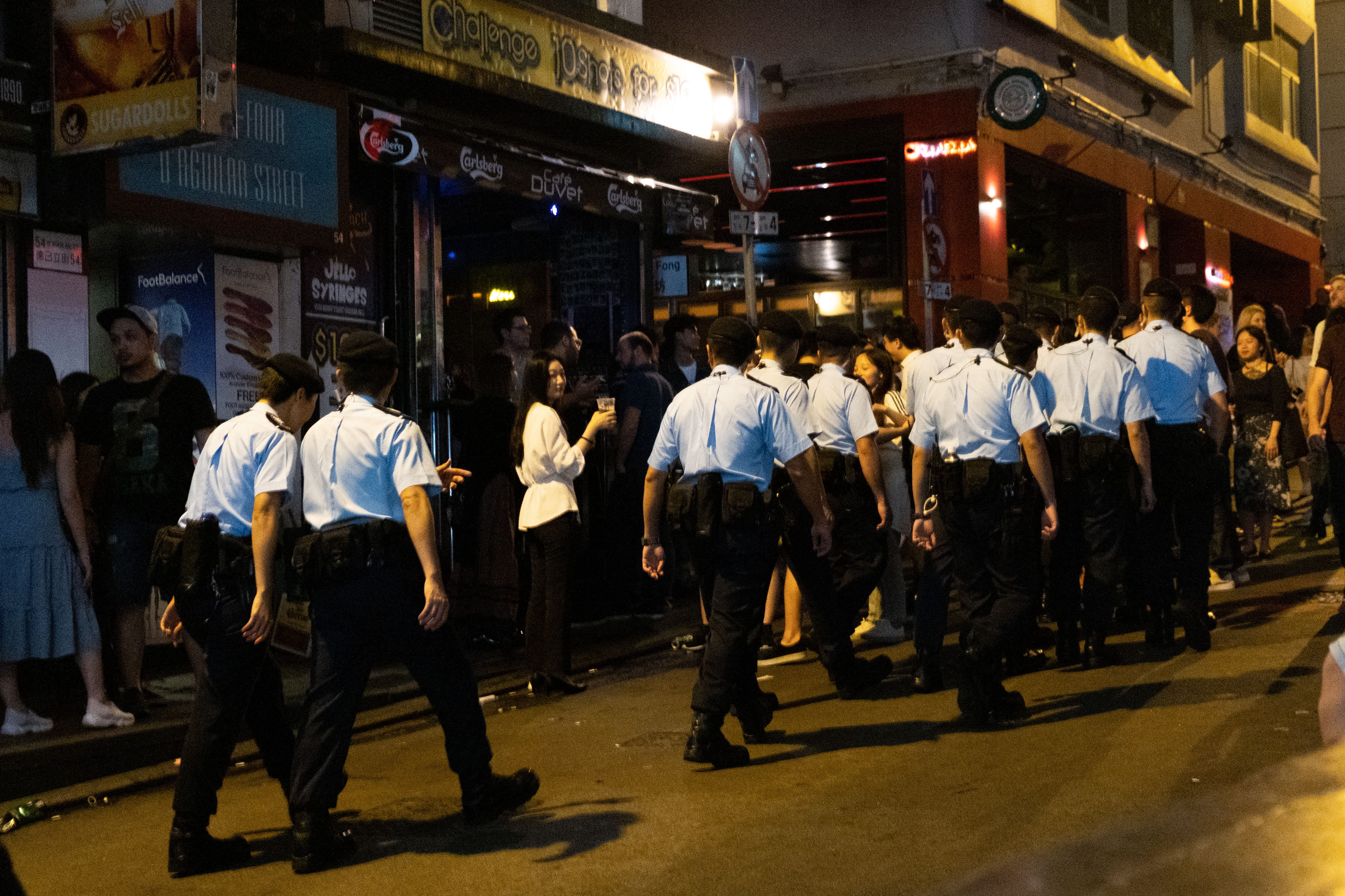A large group of policeman in full suit were petroling at midnight in Lan Kwai Fong.