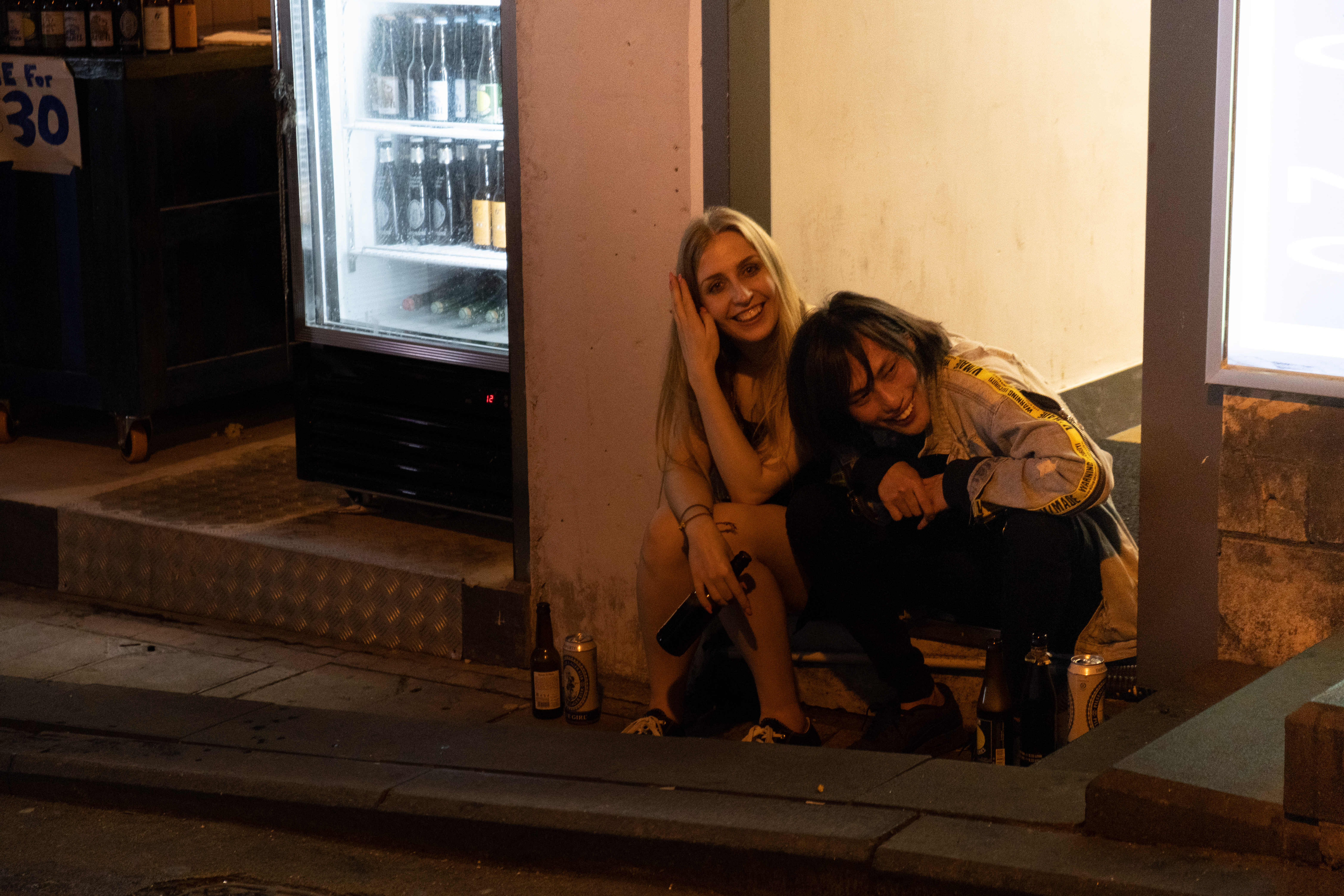 Four girls were chatting while sitting on a staircase outside a bar in Lan Kwai Fong. There was a girl holding a bottle of Smirnoff ICe.