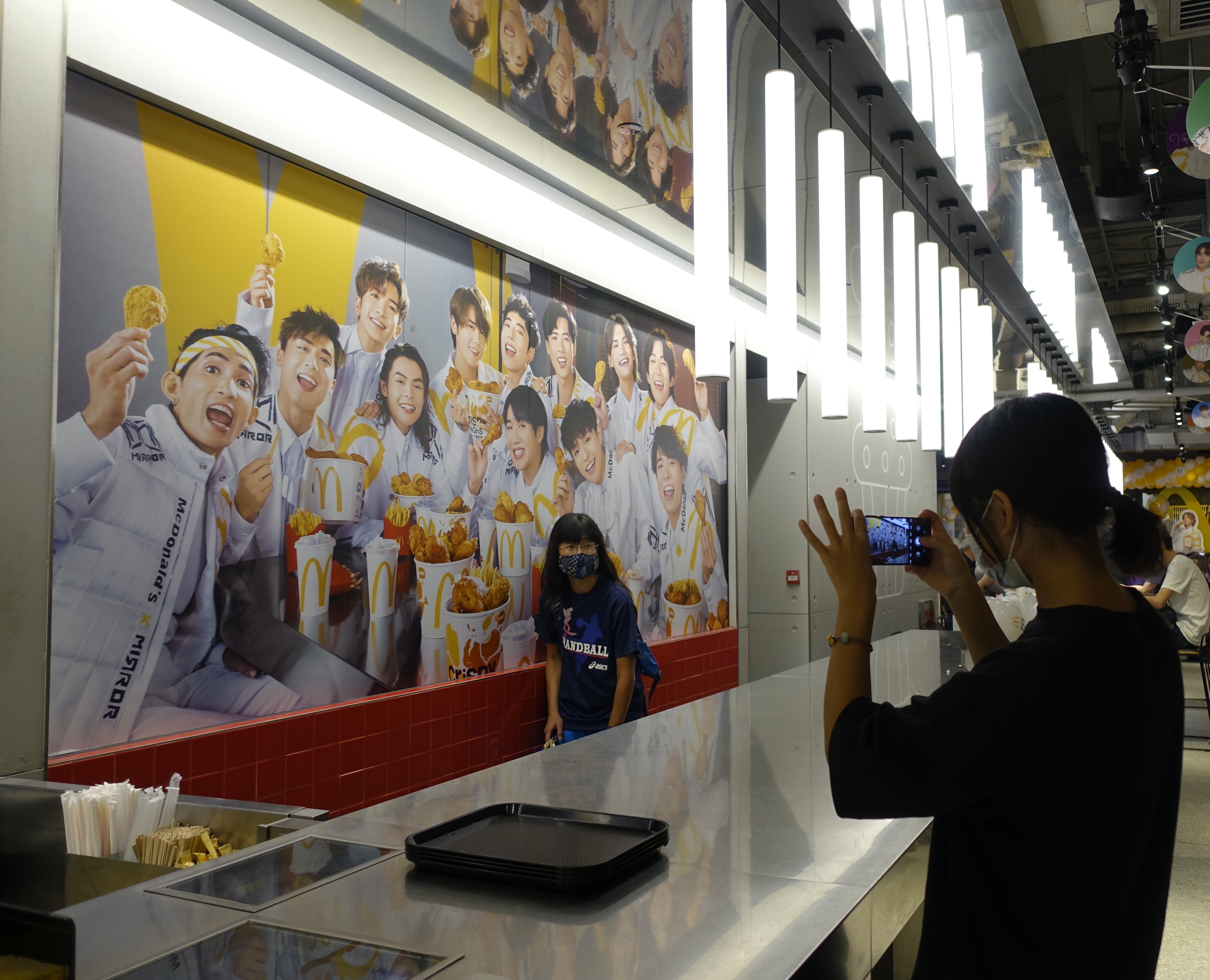 Walk into any McDonalds in Hong Kong and you will see the faces of Mirror’s 12 members plastered on food packaging boxes, billboards, and automated self-ordering kiosks. The ever hungry-for-profit fast-food chain has gone all out to celebrate the 3rd anniversary of Mirror’s debut. All its 245 stores have been transformed into Mirror-themed shrines. Each store features one member but the restaurant at Admiralty Centre celebrates them all.
