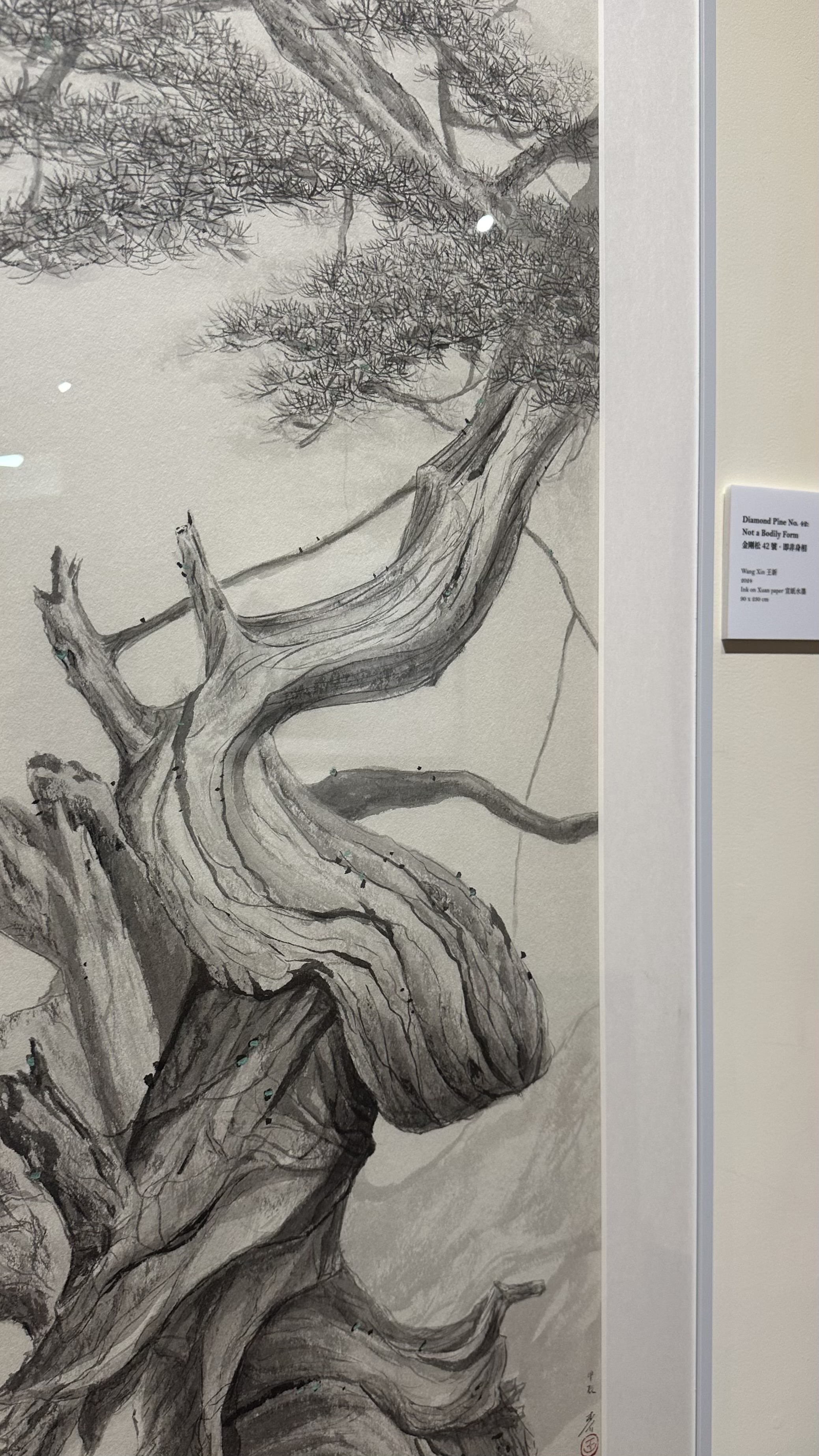 Wang Xin’s exhibition at HKU is not only a visual experience but also a philosophical reflection. Drawing inspiration from the Diamond Sutra, a foundational Buddhist teaching, Wang’s ink paintings of pine trees explore impermanence, emptiness, and resilience. His compositions balance rocks and trees with void spaces. This way, Wang translates meaning through absence, encouraging the viewer to contemplate the art. Furthermore, the calligraphy, as a part of the composition, presents extracts from Diamond Sutra. It is different for each painting and aims to complete their spiritual meanings.