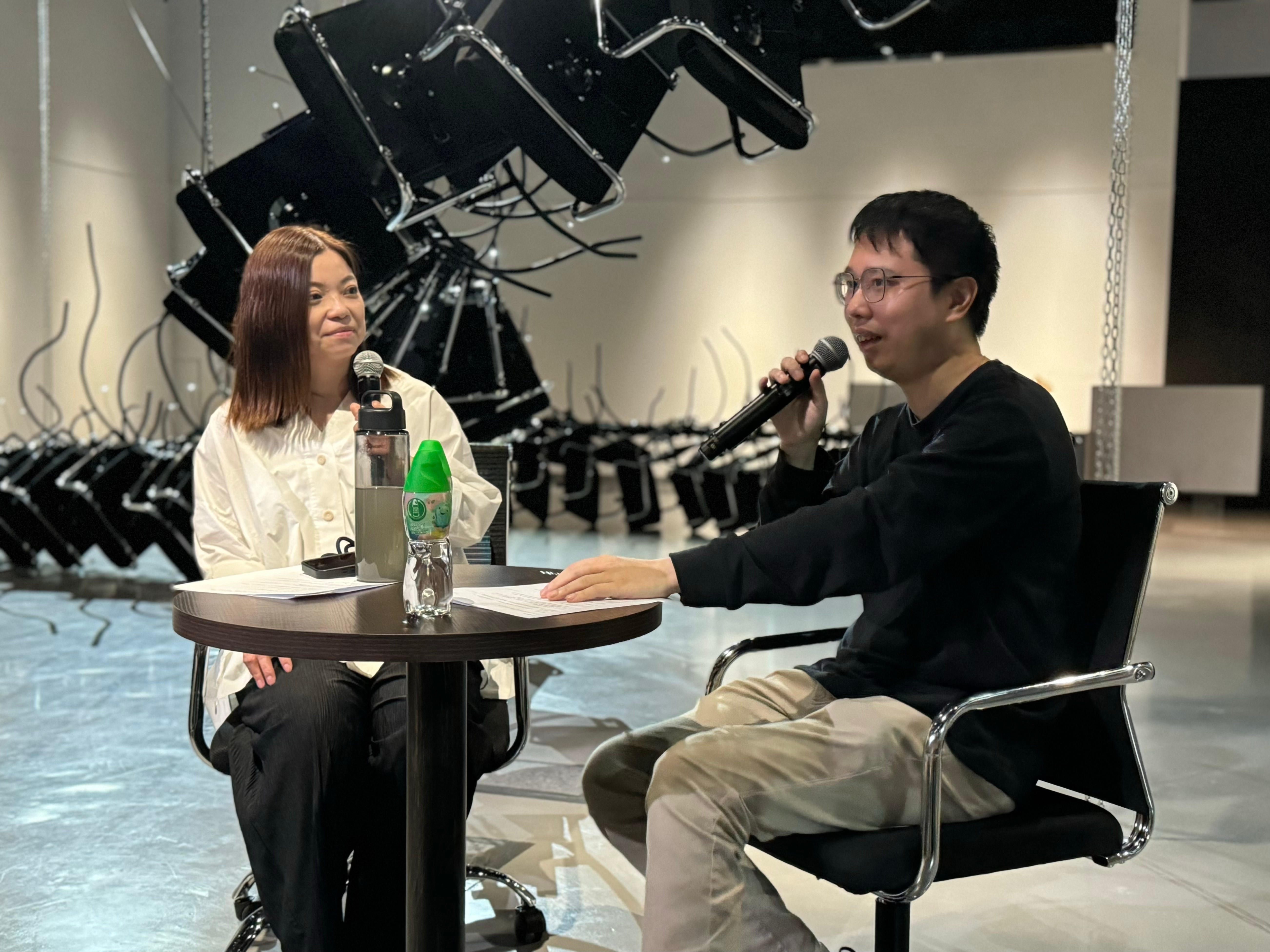 During an artist tour and sharing session on 11 April, Hui was joined by guest speaker Dickson Yuen, a former artist at TV Most, for an on-stage dialogue. The two explored the ideas behind the works from different perspectives.