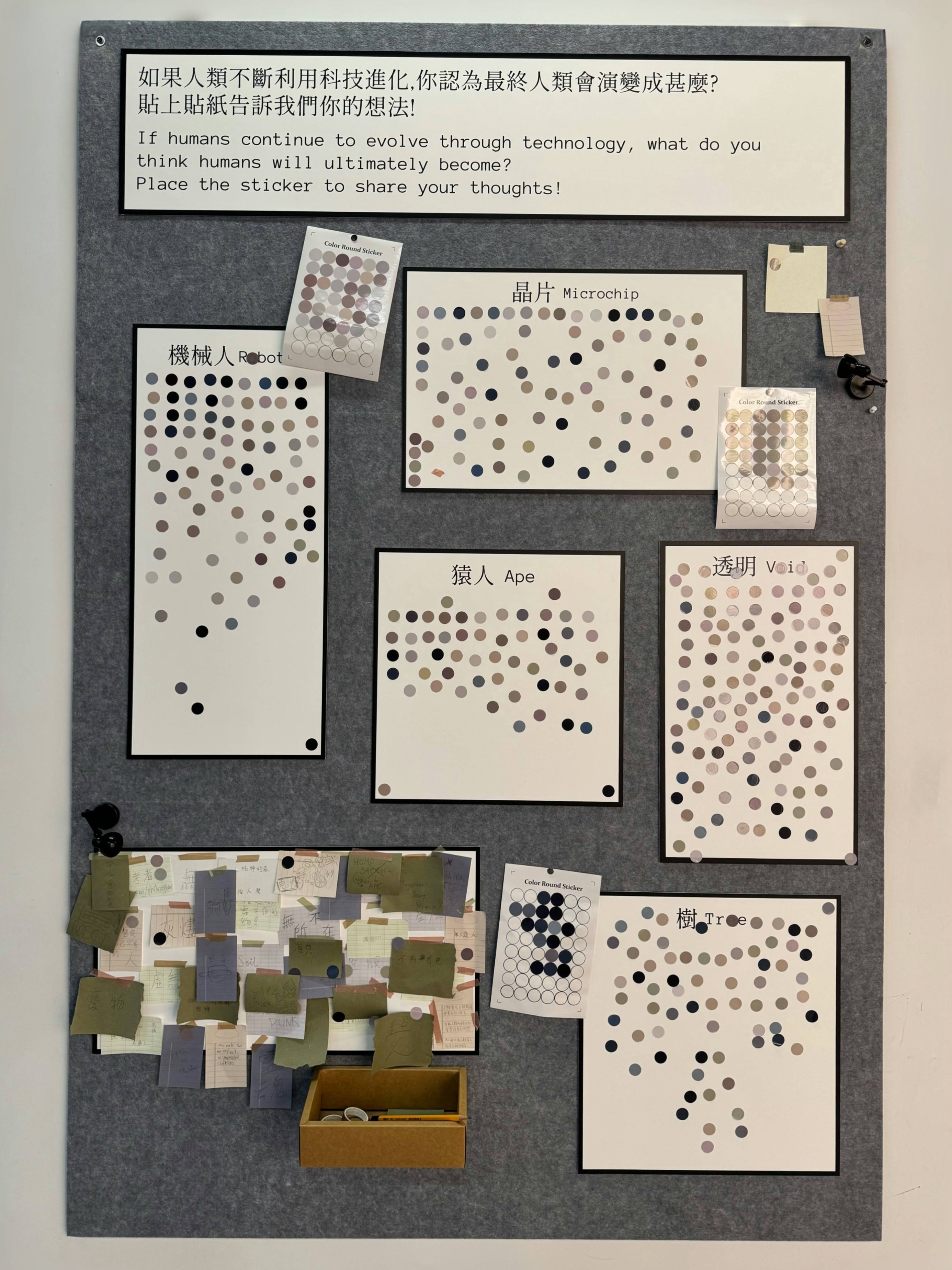 The exhibition’s interactive message wall has become another focal point for collective reflection. Printed on the wall are two questions: “If humans continue to evolve using technology, what do you think humans will ultimately become?” and “What is one quality you believe technology could never replicate?”
